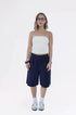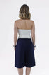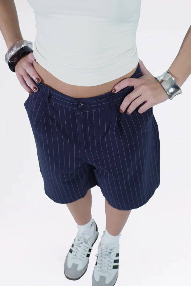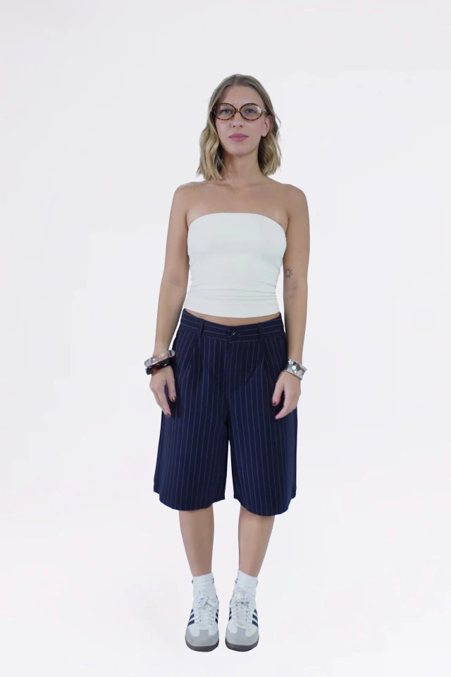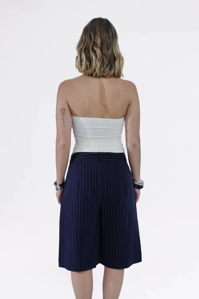 Bermuda cintura baixa, alfaiataria risca de giz. Possui bolso faca na frente com passantes no cós e botão forrado na frente. Possui uma prega na frente em cada perna para um caimento perfeito, assim como pregas na parte de tras.