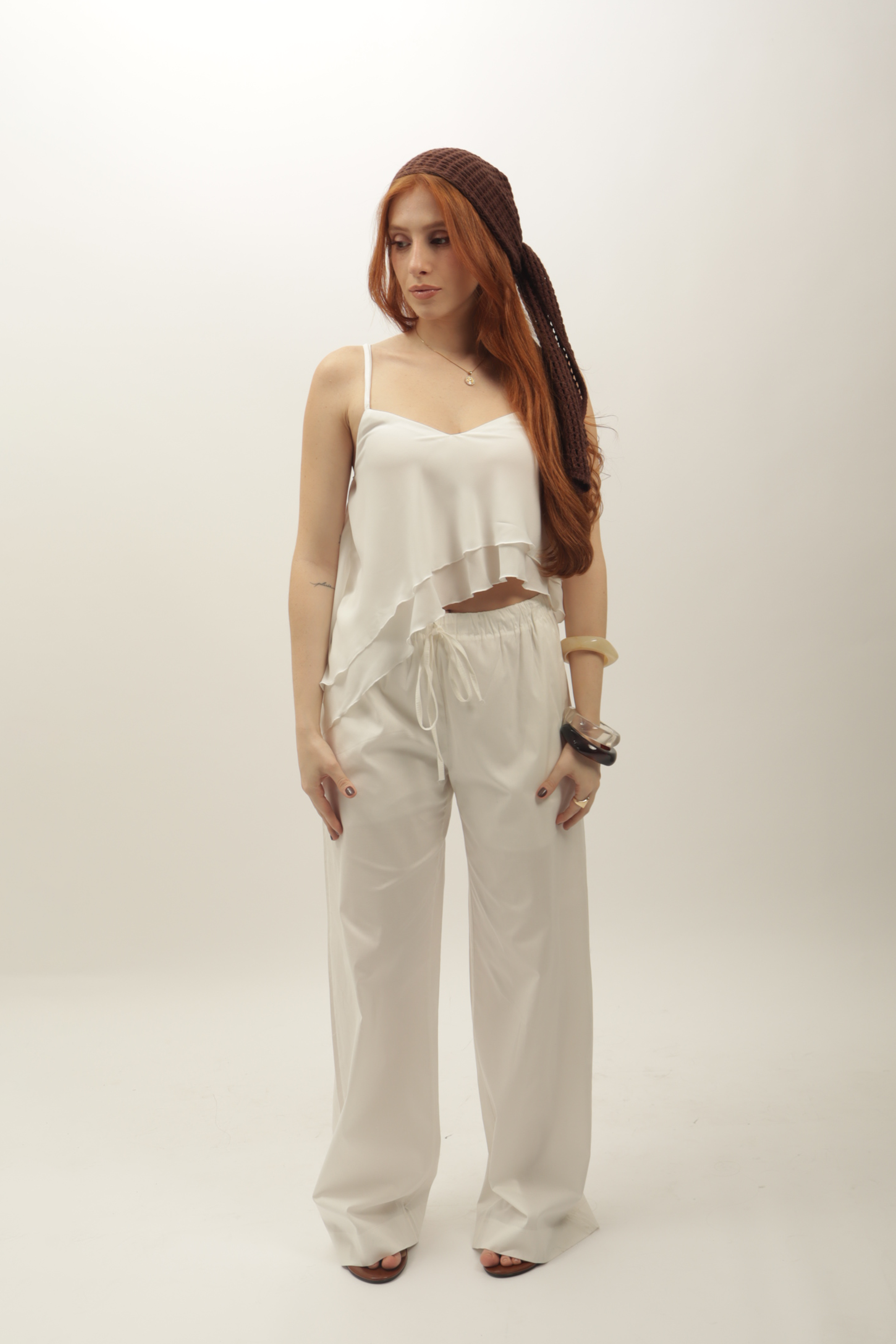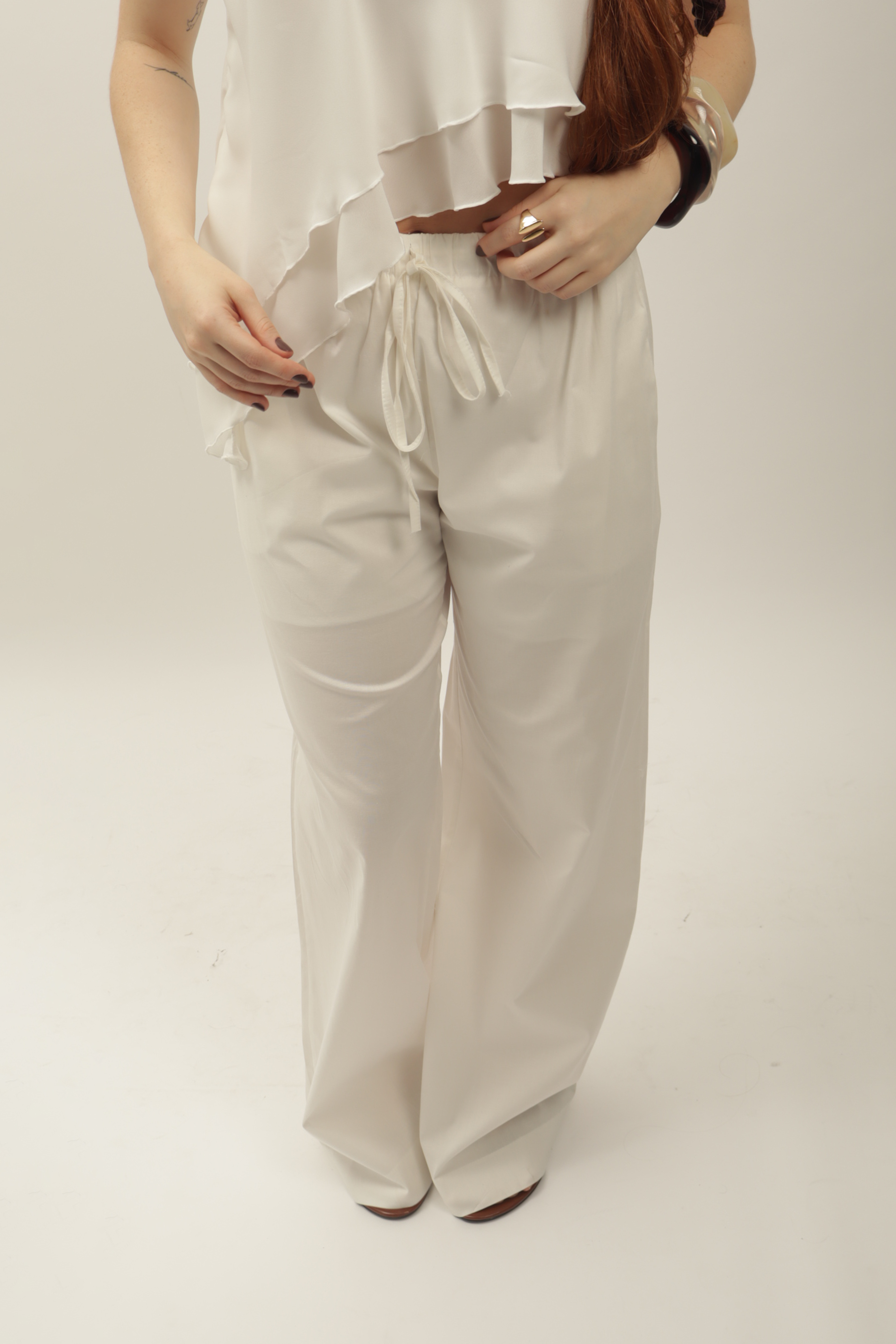 A calça bianca toda em tricoline com modelagem reta, possui elástico em em toda cintura, com cordão para amarrar na frente, também possui bolsos nas laterais e forro em shorts curto