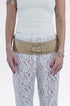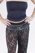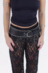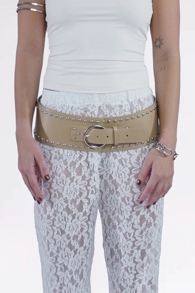 cinto cintura baixa em couro cintético, cravejado com tachas de metal prata em toda a circunferencia da cintura, com fivela na frente prata.