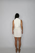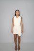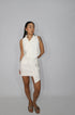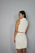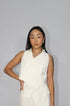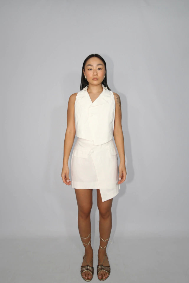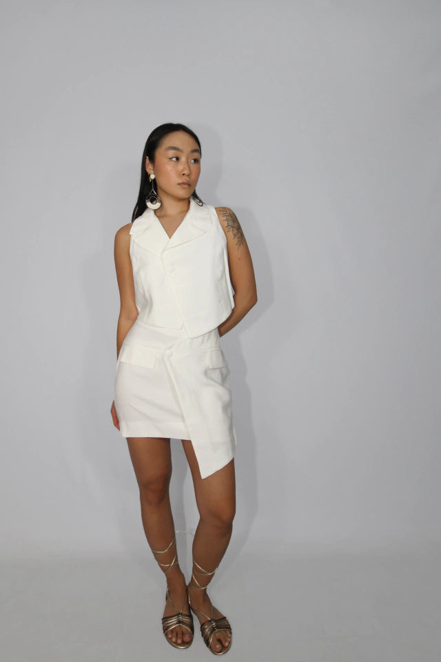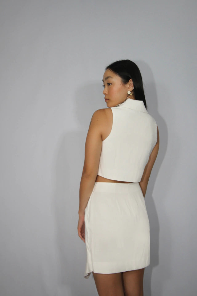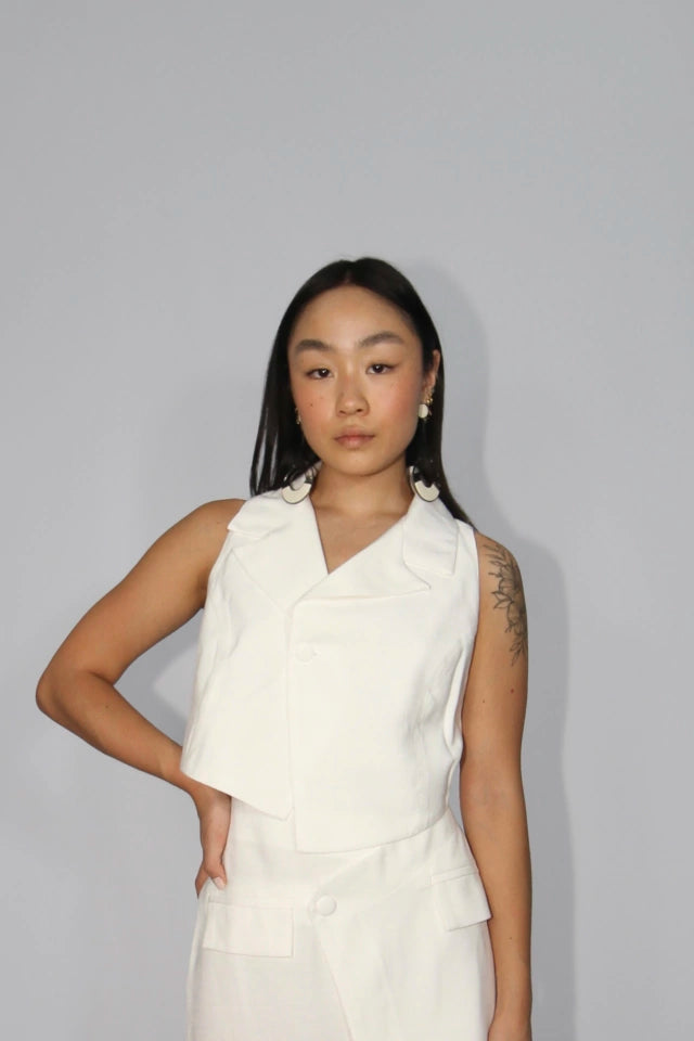 Coletinho curto assimétrico com gola de camisa social. Possui um botão na frente para fechar. Costas lisa.