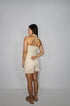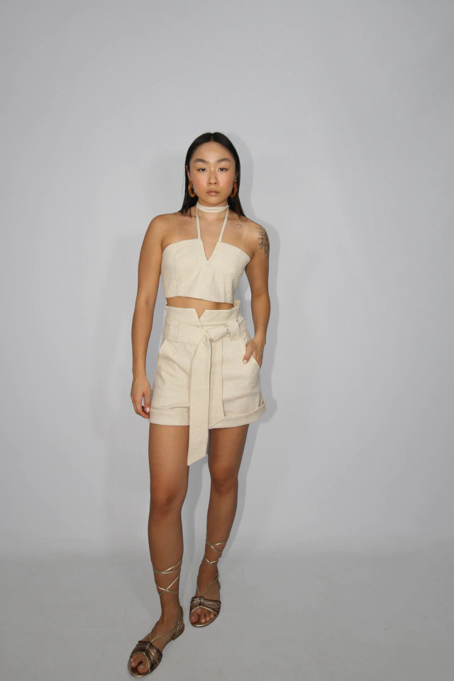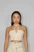 Cropped com tecido todo duplo, com decote em V na frente com tiras para amarrar no pescoço. Possui aro no. Costas com botões para fechar.