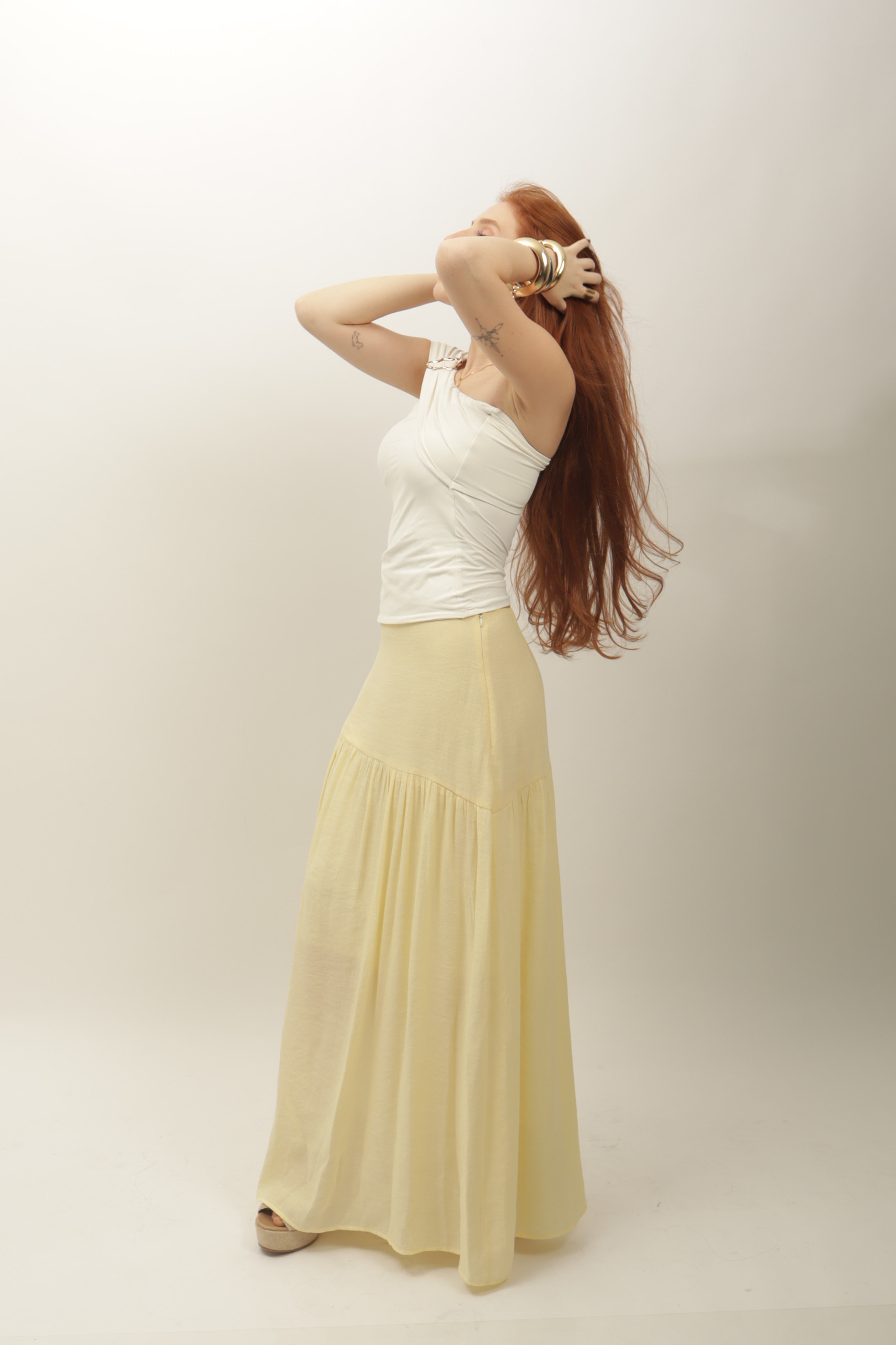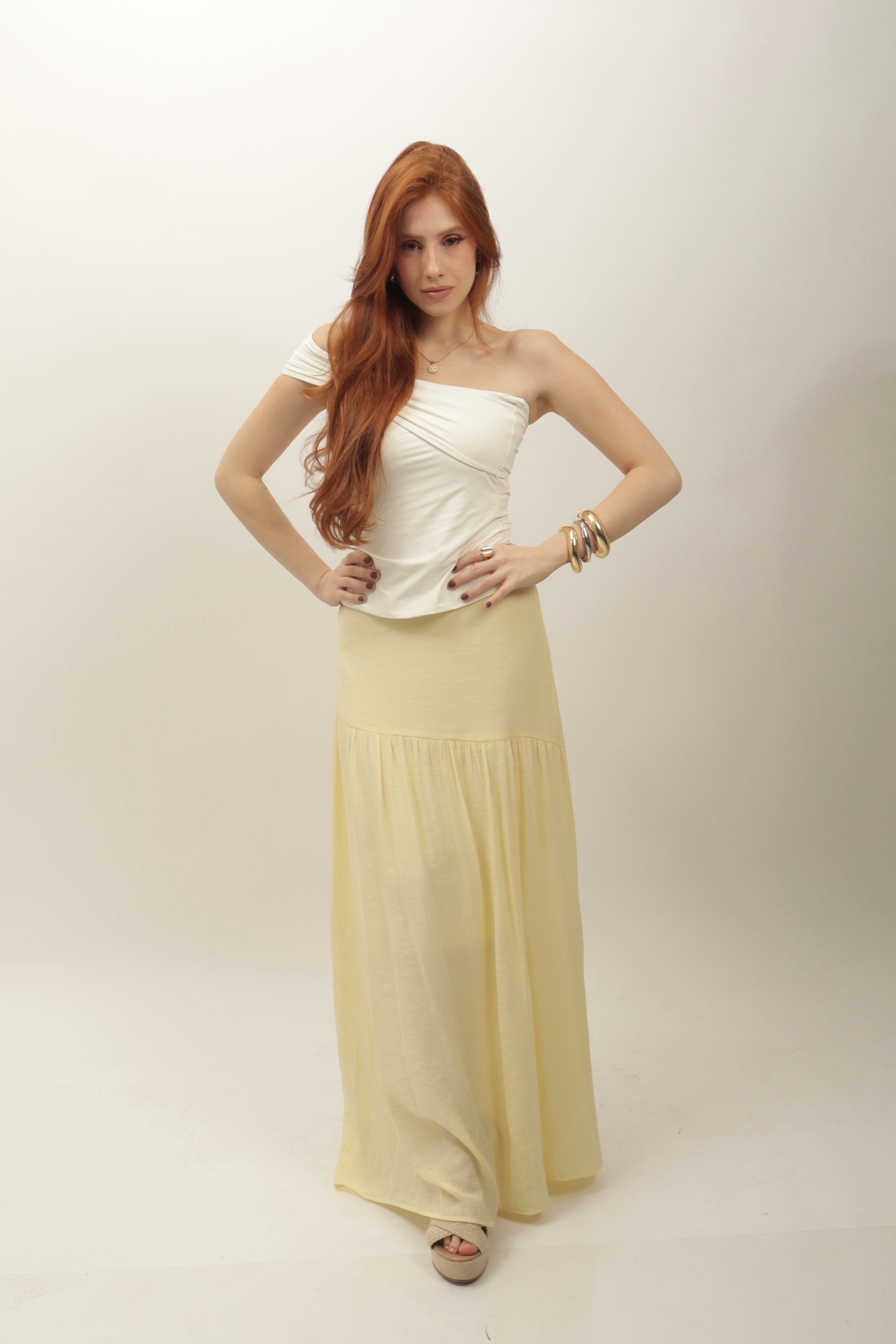 A saia longa gaby em Viscose com poliéster bem levinha é ótima para compor looks, possui zíper invisível na lateral e recorte assimétrico no quadril para modelar, com preguinhas em toda a volta. também possui forro para não marcar.