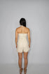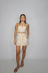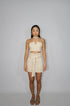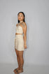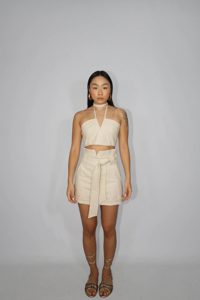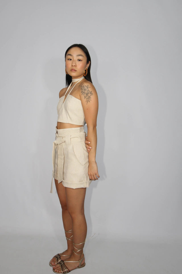 Shorts cintura alta com bolso faca frontal, com botão e zíper na frente para fechar. Possui passantes na cintura e acompanha cinto do mesmo tecido. O traseiro é liso com bolso embutido.